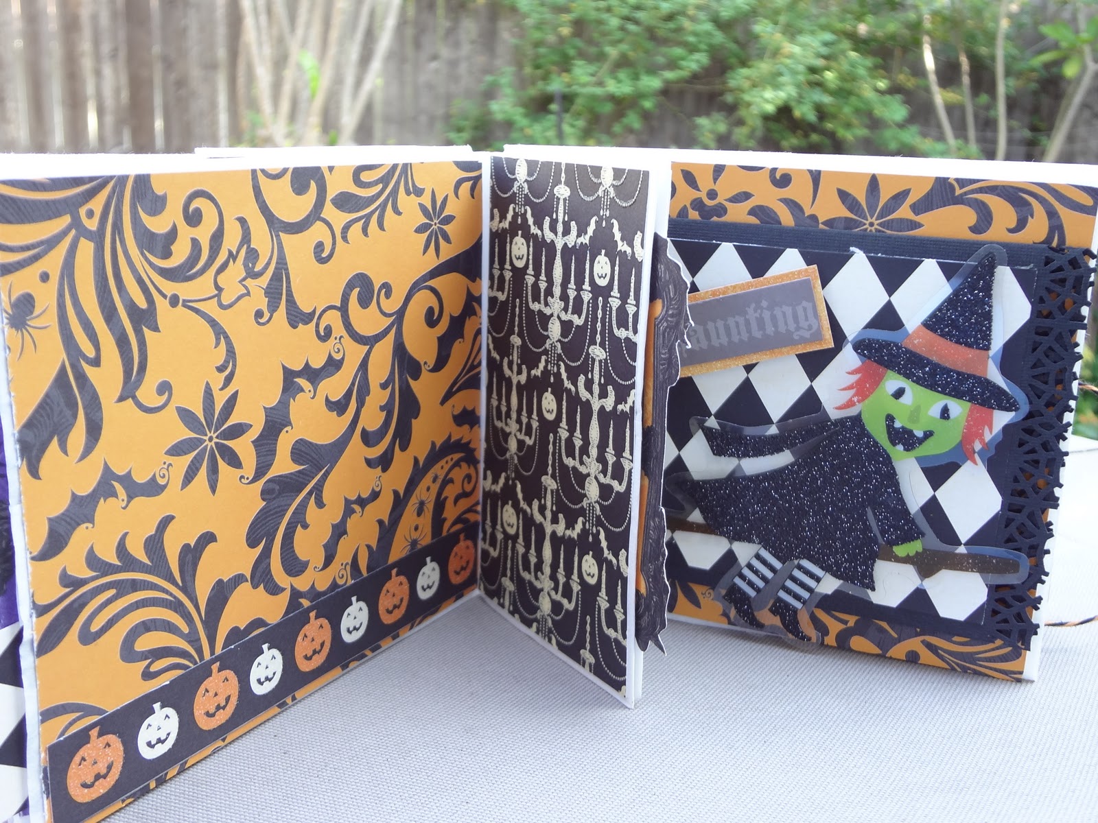 One of my all time favorite things to make are mini albums. I made this Fright Night Paper Bag Mini Album to capture this years Halloween pictures. I added a few twist to the normal paper bag album by making three different fold outs for more pictures to jazz it up a little and I have provided some directions for how I did that. If you have never made a paper bag album there are tons of videos on You Tube to show you how.